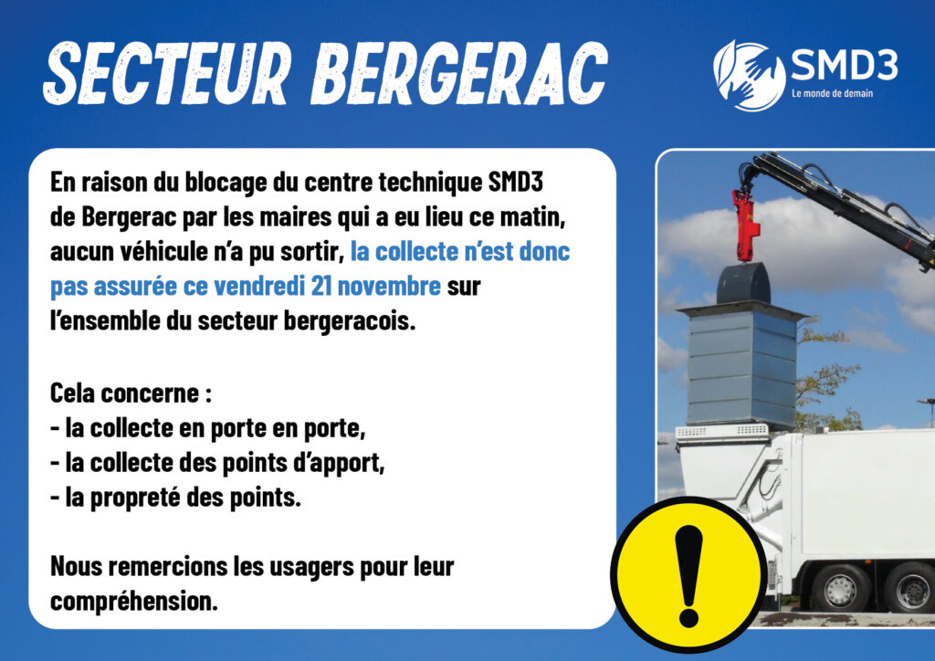 En raison du blocage du centre technique SMD3 de Bergerac par plusieurs maires ce matin, aucun véhicule n’a pu sortir…