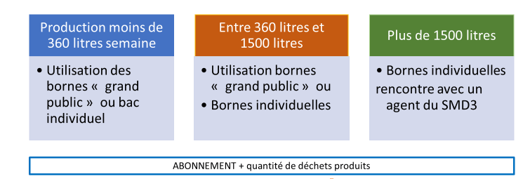 Sous certaines conditions(*), après étude et validation du dossier par le SMD3, les professionnels générant plus de 1500L de déchets résiduels par semaine peuvent bénéficier de bornes individuelles disponibles à la location.