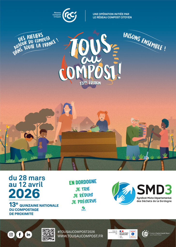 « Tous au compost ! » est un événement national qui se déroule chaque année partout en France. Pour cette 13ᵉ édition, le SMD3 se mobilise en Dordogne afin de promouvoir le compostage et la réduction des déchets.